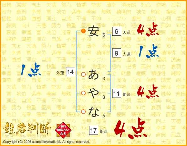 生活面を象徴する運勢です。外部から受ける影響力を表し、結婚運、家庭運や職場、環境への順応性を表します。総運から人運を引いた画数。姓や名が1文字の場合を除く。