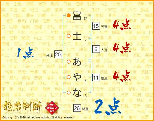 富士あやなさんの総運は26画の2点!
