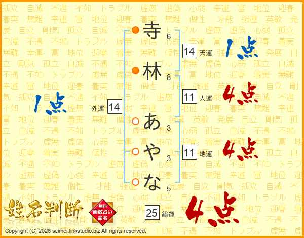 寺林あやなさんの総運は25画の4点!