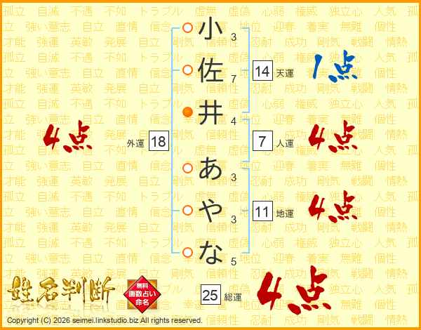 小佐井あやなさんの総運は25画の4点!