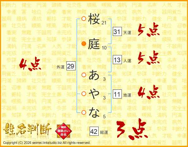 桜庭あやなさんの総運は42画の3点!