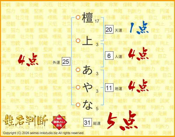 檀上あやなさんの総運は31画の5点!