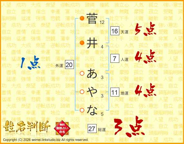 菅井あやなさんの総運は27画の3点!