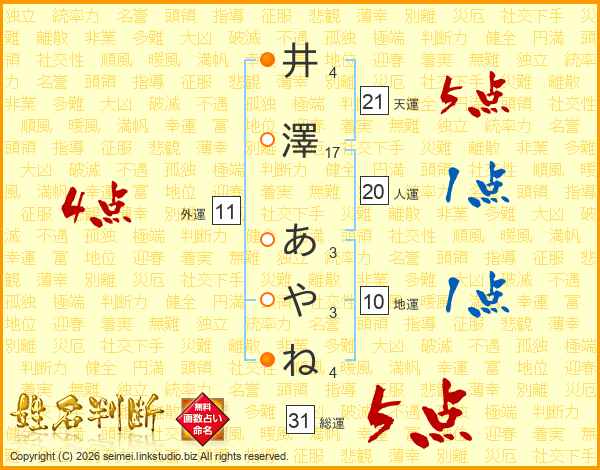 井澤あやねさんの総運は31画の5点!