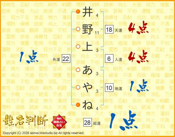 井野上あやねさんの総運は28画の1点!