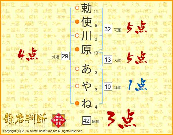 勅使川原あやねさんの総運は42画の3点!