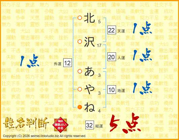 北沢あやねさんの総運は32画の5点!