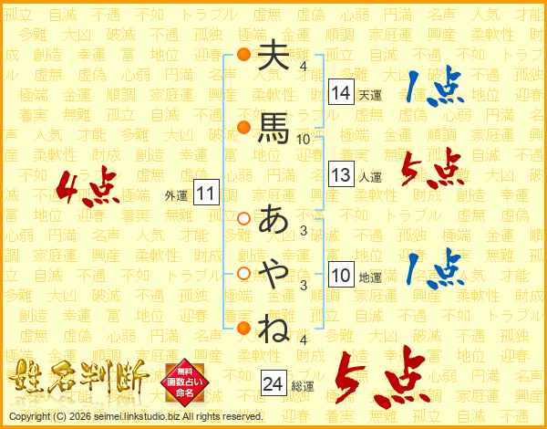 夫(4画)馬(10画) あ(3画)や(3画)ね(4画)