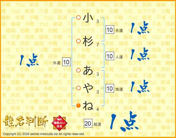 小杉あやねさんの総運は20画の1点!