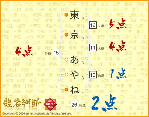 東京あやねさんの総運は26画の2点!