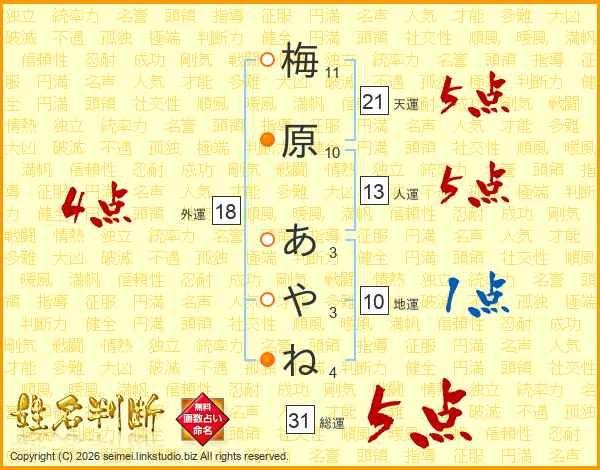 梅(11画)原(10画) あ(3画)や(3画)ね(4画)