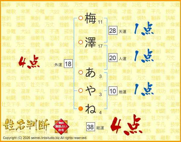 梅澤あやねさんの総運は38画の4点!