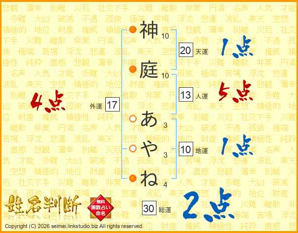 神(10画)庭(10画) あ(3画)や(3画)ね(4画)