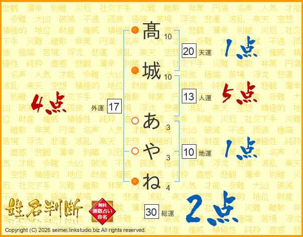 髙(10画)城(10画) あ(3画)や(3画)ね(4画)