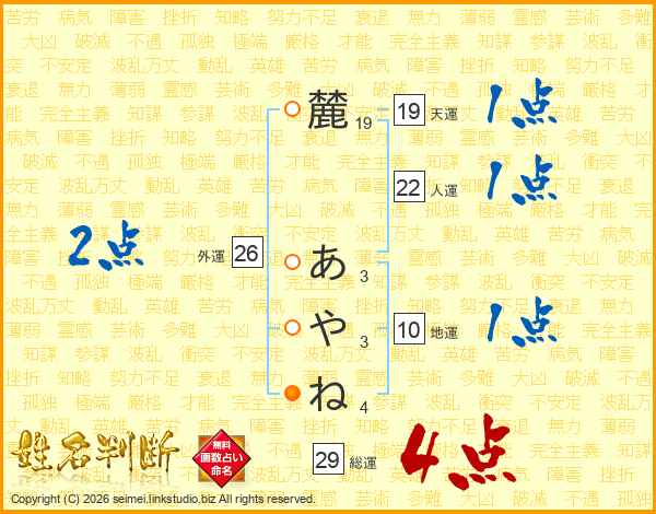 生活面を象徴する運勢です。外部から受ける影響力を表し、結婚運、家庭運や職場、環境への順応性を表します。総運から人運を引いた画数。姓や名が1文字の場合を除く。