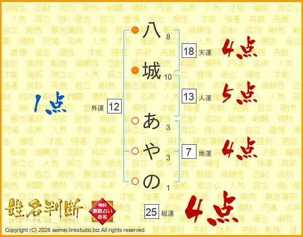 八城あやのさんの総運は25画の4点!