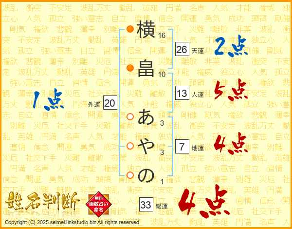 生活面を象徴する運勢です。外部から受ける影響力を表し、結婚運、家庭運や職場、環境への順応性を表します。総運から人運を引いた画数。姓や名が1文字の場合を除く。