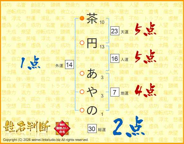 茶(10画)円(13画) あ(3画)や(3画)の(1画)