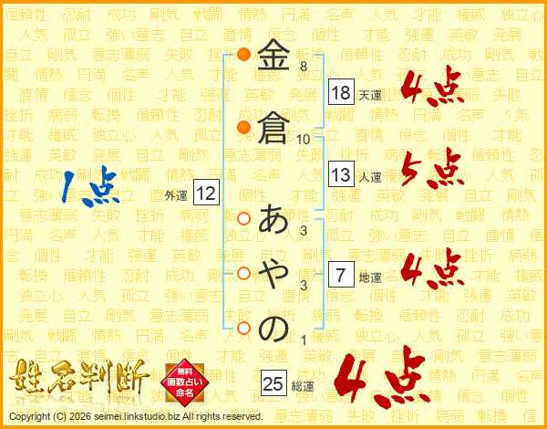 金倉あやのさんの総運は25画の4点!