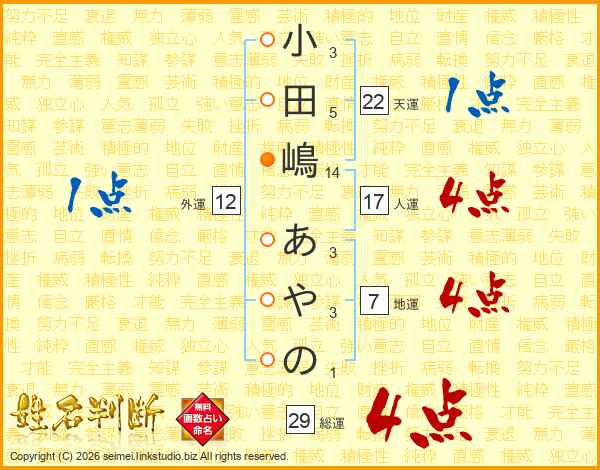 小田嶋あやのさんの総運は29画の4点!
