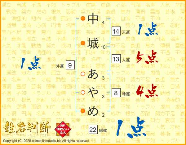 生活面を象徴する運勢です。外部から受ける影響力を表し、結婚運、家庭運や職場、環境への順応性を表します。総運から人運を引いた画数。姓や名が1文字の場合を除く。