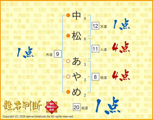 中(4画)松(8画) あ(3画)や(3画)め(2画)