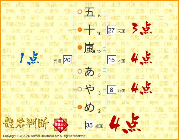 五十嵐あやめさんの総運は35画の4点!
