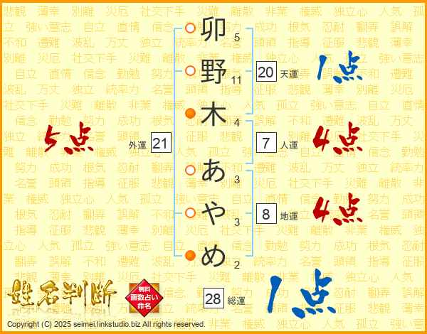 生活面を象徴する運勢です。外部から受ける影響力を表し、結婚運、家庭運や職場、環境への順応性を表します。総運から人運を引いた画数。姓や名が1文字の場合を除く。