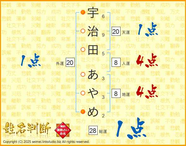 宇治田あやめさんの総運は28画の1点!