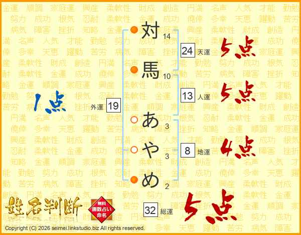 対馬あやめさんの総運は32画の5点!