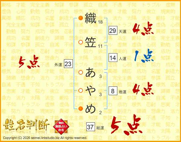 織笠あやめさんの天運は29画の4点!