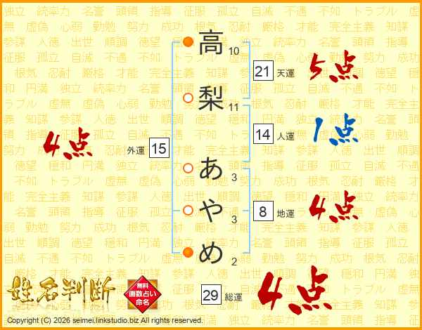 高(10画)梨(11画) あ(3画)や(3画)め(2画)