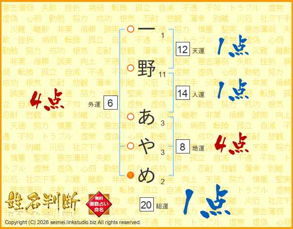 生活面を象徴する運勢です。外部から受ける影響力を表し、結婚運、家庭運や職場、環境への順応性を表します。総運から人運を引いた画数。姓や名が1文字の場合を除く。