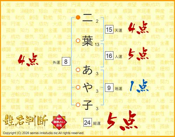 二(2画)葉(13画) あ(3画)や(3画)子(3画)