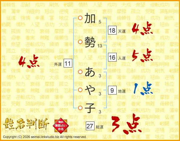 加(5画)勢(13画) あ(3画)や(3画)子(3画)
