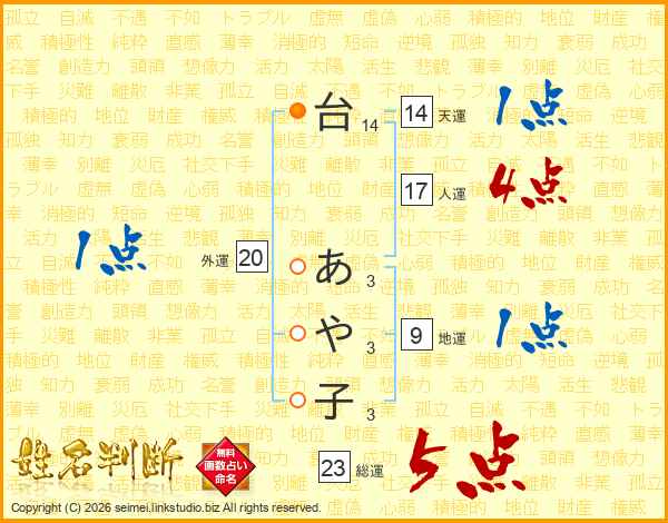 生活面を象徴する運勢です。外部から受ける影響力を表し、結婚運、家庭運や職場、環境への順応性を表します。総運から人運を引いた画数。姓や名が1文字の場合を除く。