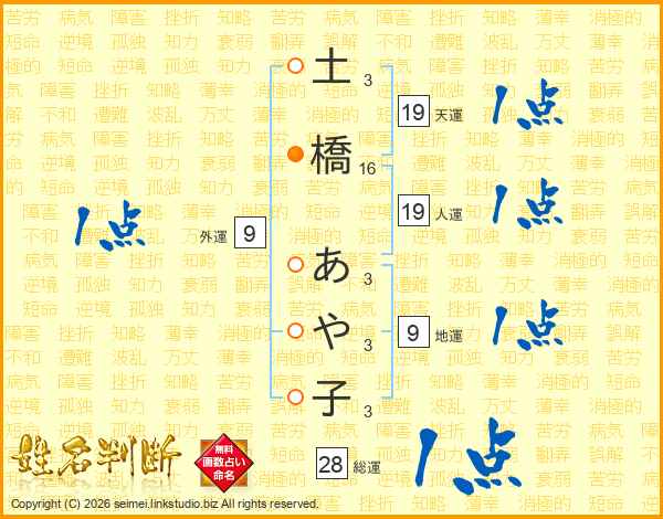 土(3画)橋(16画) あ(3画)や(3画)子(3画)