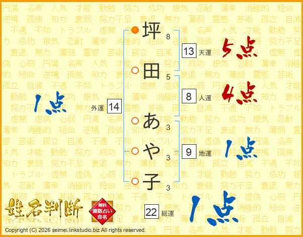 坪(8画)田(5画) あ(3画)や(3画)子(3画)