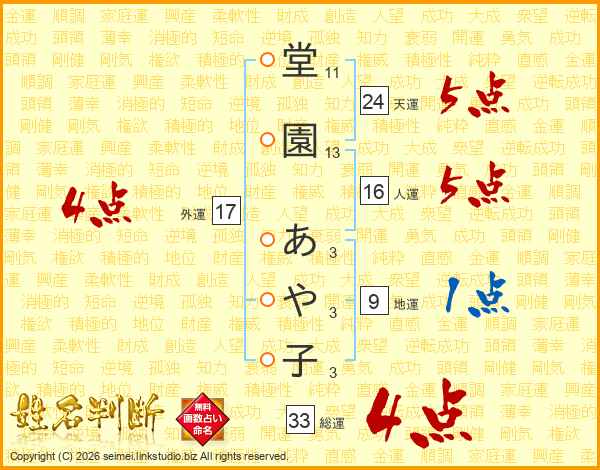 堂(11画)園(13画) あ(3画)や(3画)子(3画)
