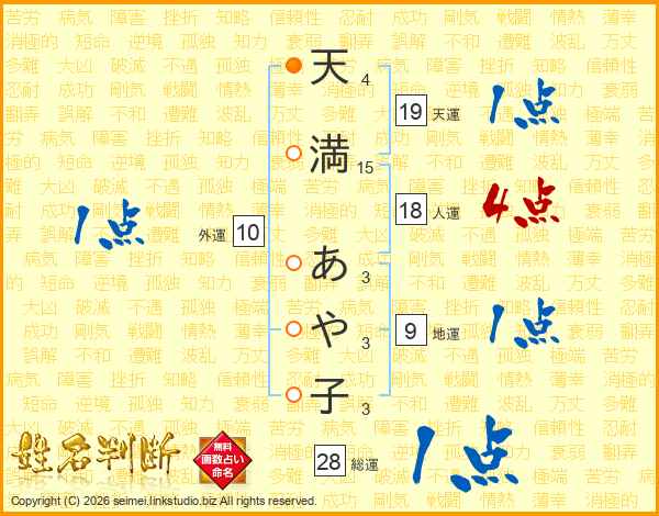 天(4画)満(15画) あ(3画)や(3画)子(3画)