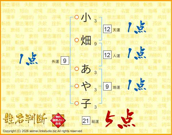 小畑あや子さんの総運は21画の5点!