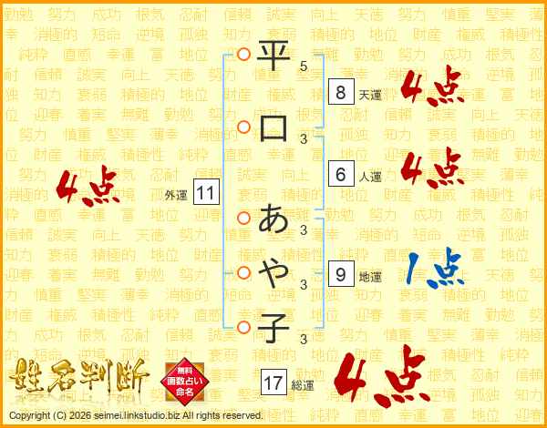 平(5画)口(3画) あ(3画)や(3画)子(3画)