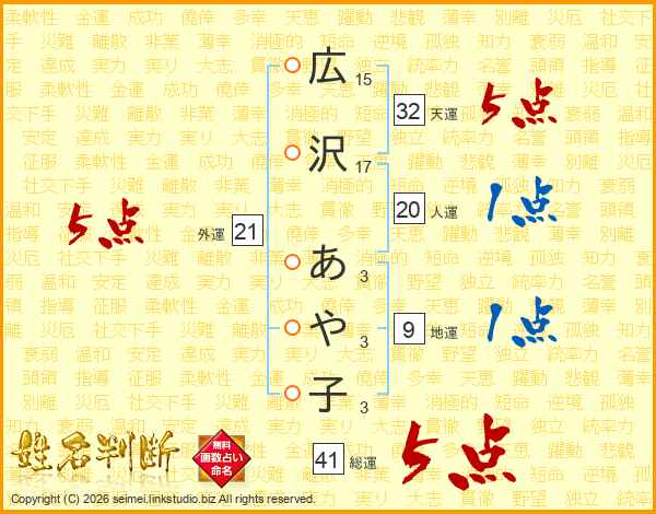 広沢あや子さんの外運は21画の5点!