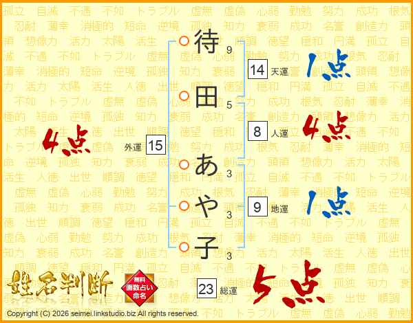 待(9画)田(5画) あ(3画)や(3画)子(3画)
