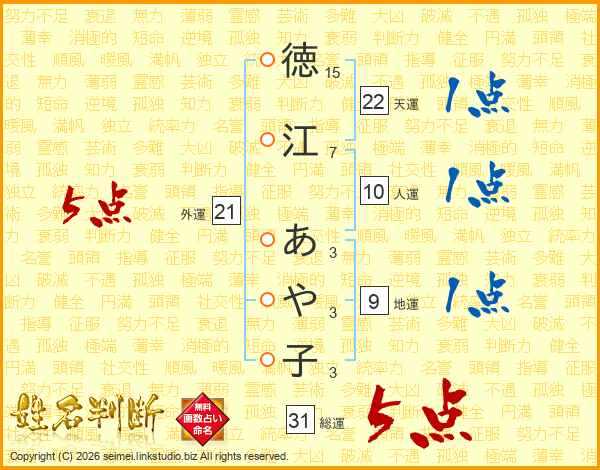 徳(15画)江(7画) あ(3画)や(3画)子(3画)
