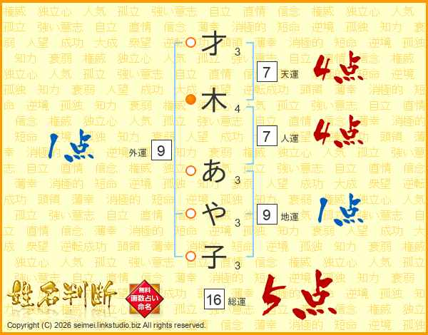 才(3画)木(4画) あ(3画)や(3画)子(3画)
