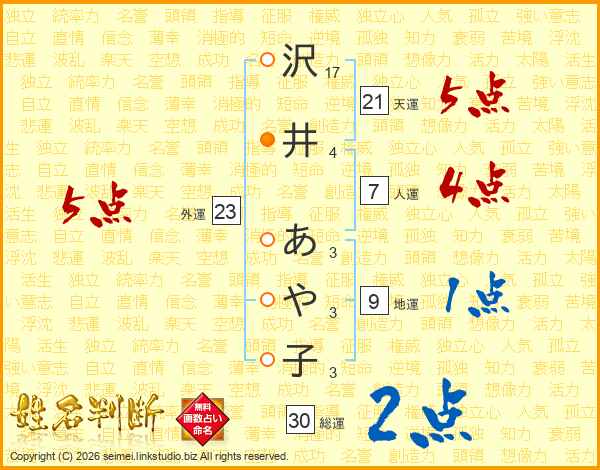沢井あや子さんの天運は21画の5点!