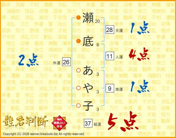 瀬底あや子さんの総運は37画の5点!