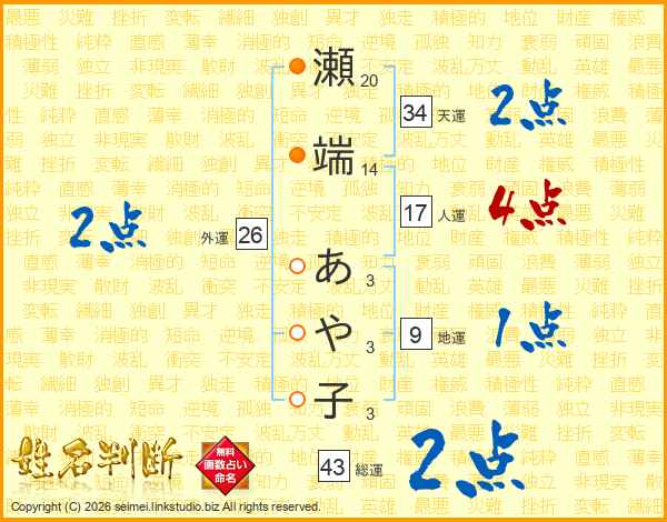 瀬(20画)端(14画) あ(3画)や(3画)子(3画)