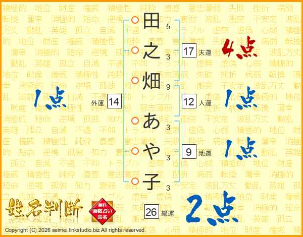 田(5画)之(3画)畑(9画) あ(3画)や(3画)子(3画)